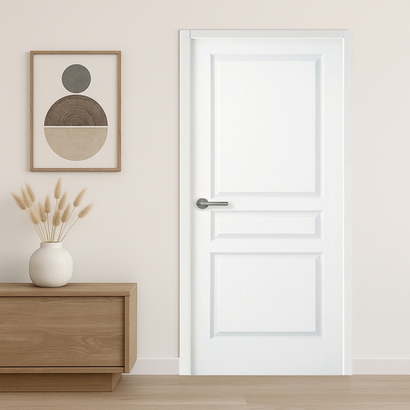 Bloc-porte comprenant emballage individuel, huisserie bois avec joint et porte battante.