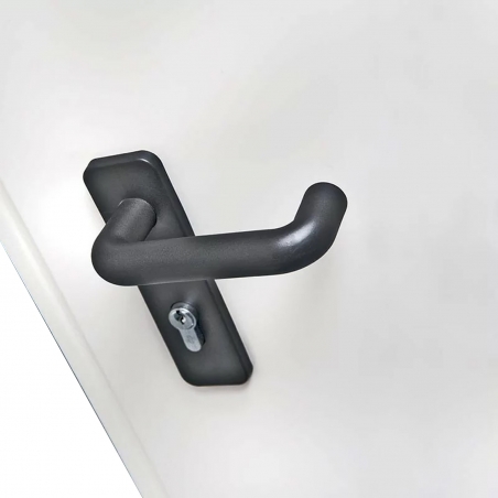 Dormant en acier galva 25/10ème Ouvrants de 50mm d'épaisseur en acier 2 faces 7/10ème Remplissage isolant CF et laine de roche Serrure encastrée de sureté 2 paumelles acier 1 pion anti dégondage Finition thermolaquage couleur RALr - Pose dans mur béton ou parpaing plein ≥12cm, châssis acier ou châssis bois existant Isolation thermique Ud= 1,98 W/(m².K) *avec le joint d'isolation