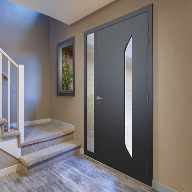 La porte d’entrée aluminium Tobaga séduit par son design épuré et contemporain, mis en valeur par un grand vitrage biseauté décoratif qui maximise l’apport de lumière naturelle. Sa ligne fine et élégante, associée à un cadre en aluminium minimaliste, confère à cette porte d’entrée vitrée un style moderne et raffiné. Idéale pour une maison contemporaine, elle combine esthétisme, luminosité et durabilité, offrant une entrée accueillante et résolument design.