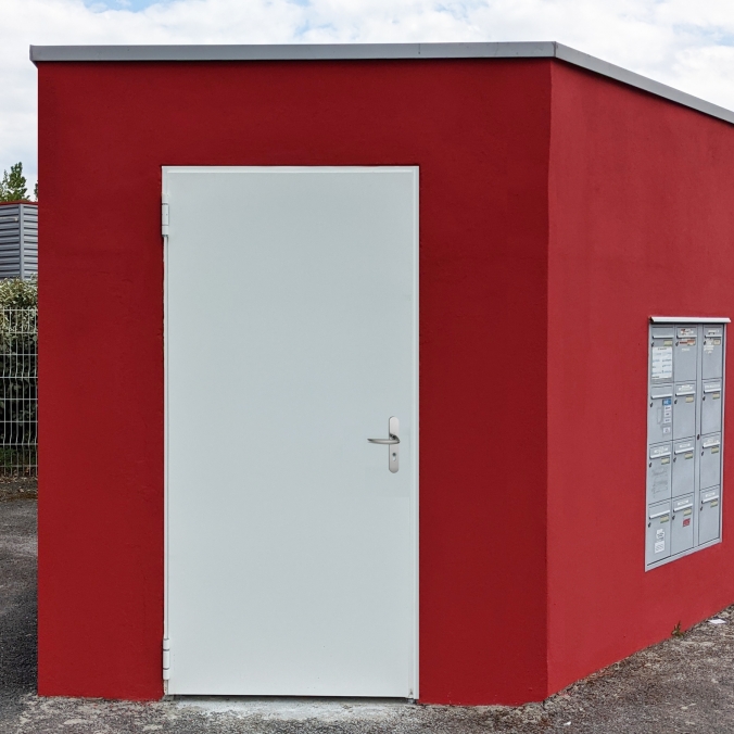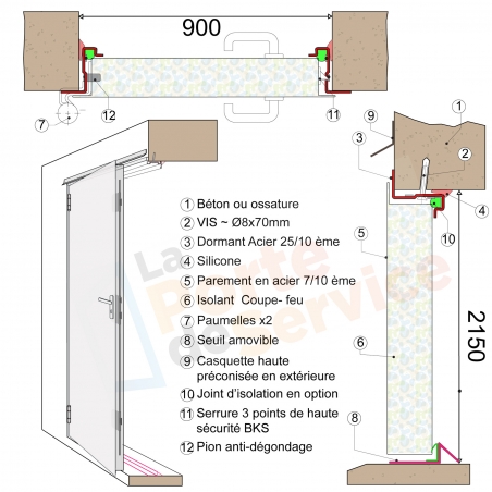 Dormant en acier Galva 25/10ème pose applique en Z Ouvrants de 50mm d'épaisseur en acier 2 faces 7/10ème Renfort interne pour montage ferme porte côté charnières Remplissage laine de roche haut densité Isolation thermique Ud= 1,98 W/(m².K) avec joints Serrure 3 points BKS de haute sécurité 2 paumelles acier et 1 pion anti dégondage Finition RAL 9010